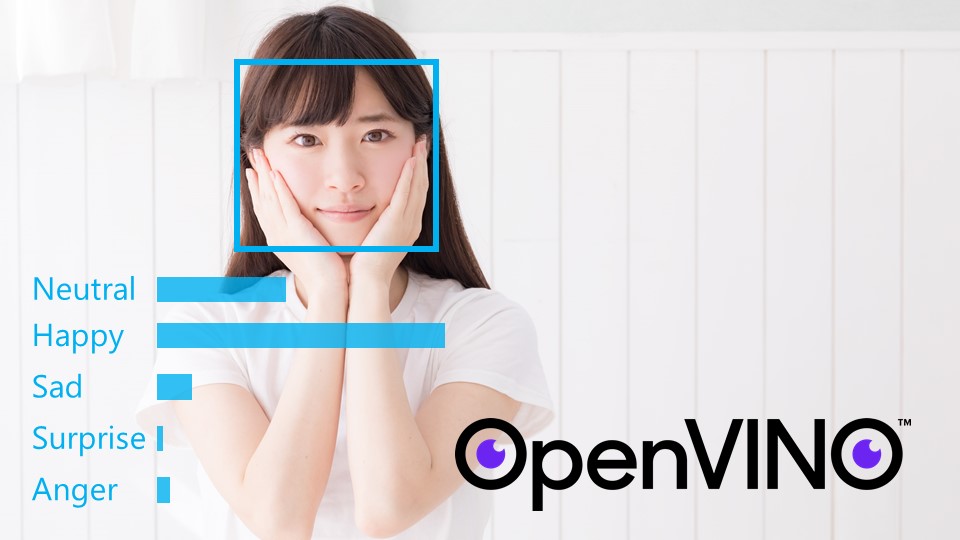 OpenVINOのディープラーニング推論エンジンを活用して、カメラ映像から「顔領域検出」「感情分類」「グラフィックス描画」までを一気にリアルタイムで行います。